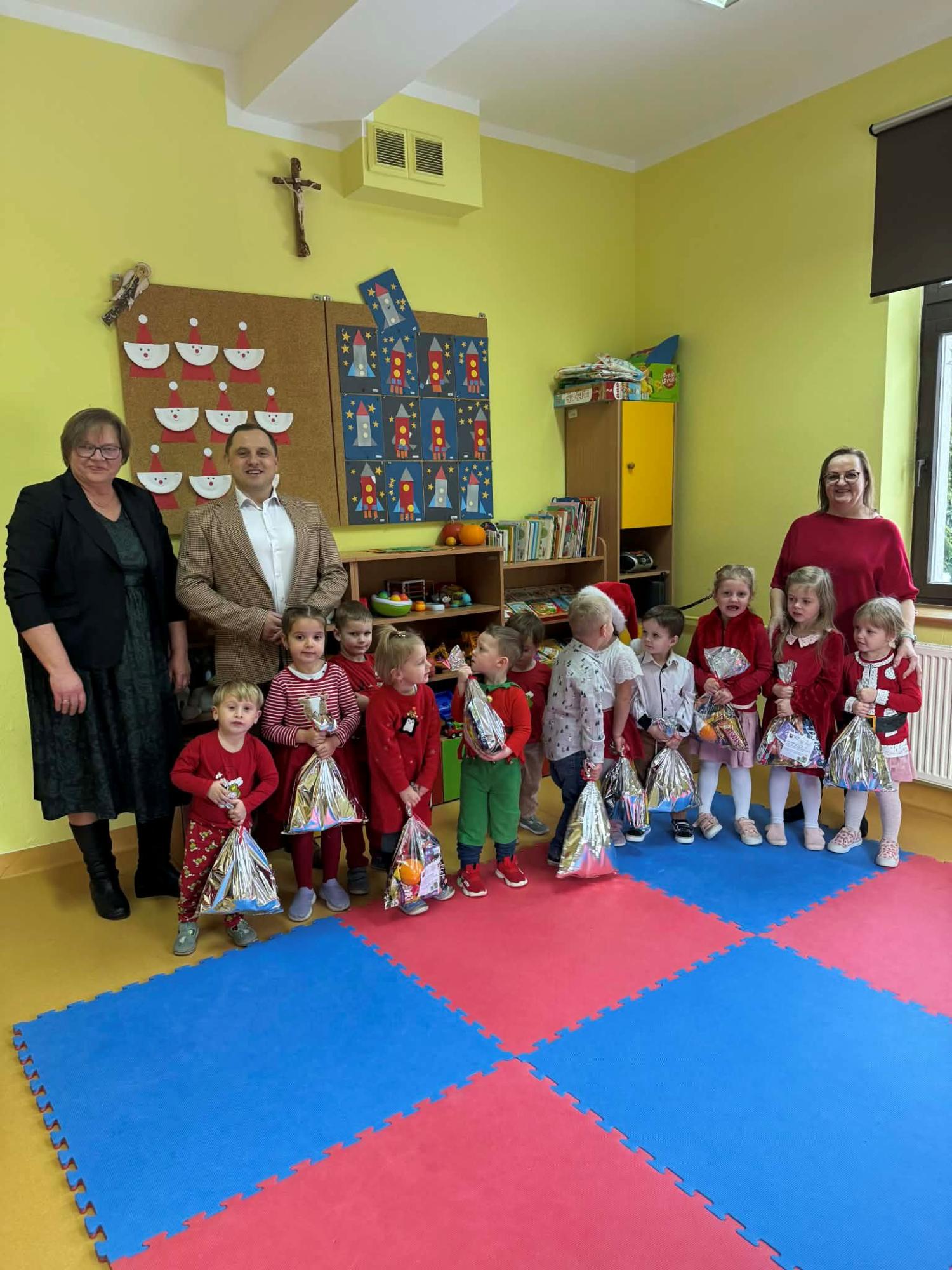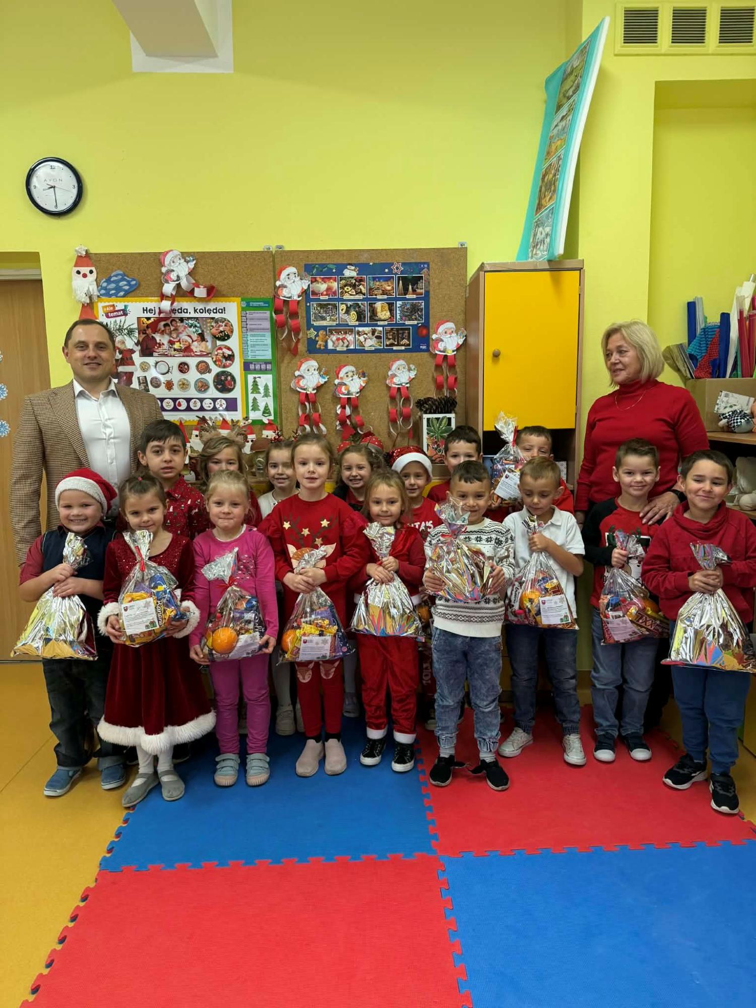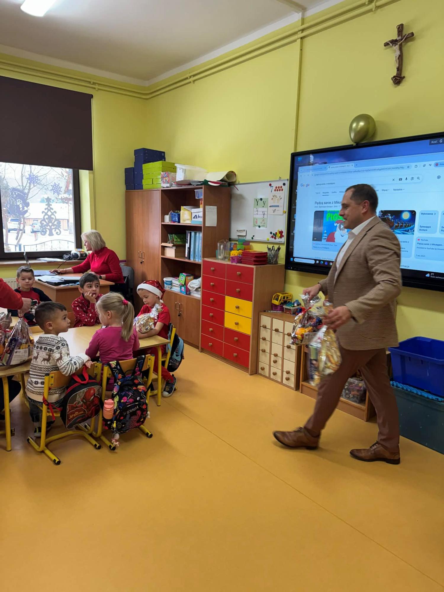 Do przedszkolaków i uczniów klasy 1 zawitał także ze świątecznymi upominkami wójt gminy - p. Andrzej Pietrzyk, który wręczył dzieciom paczki pełne smakołyków.