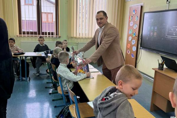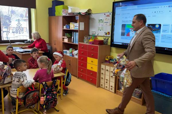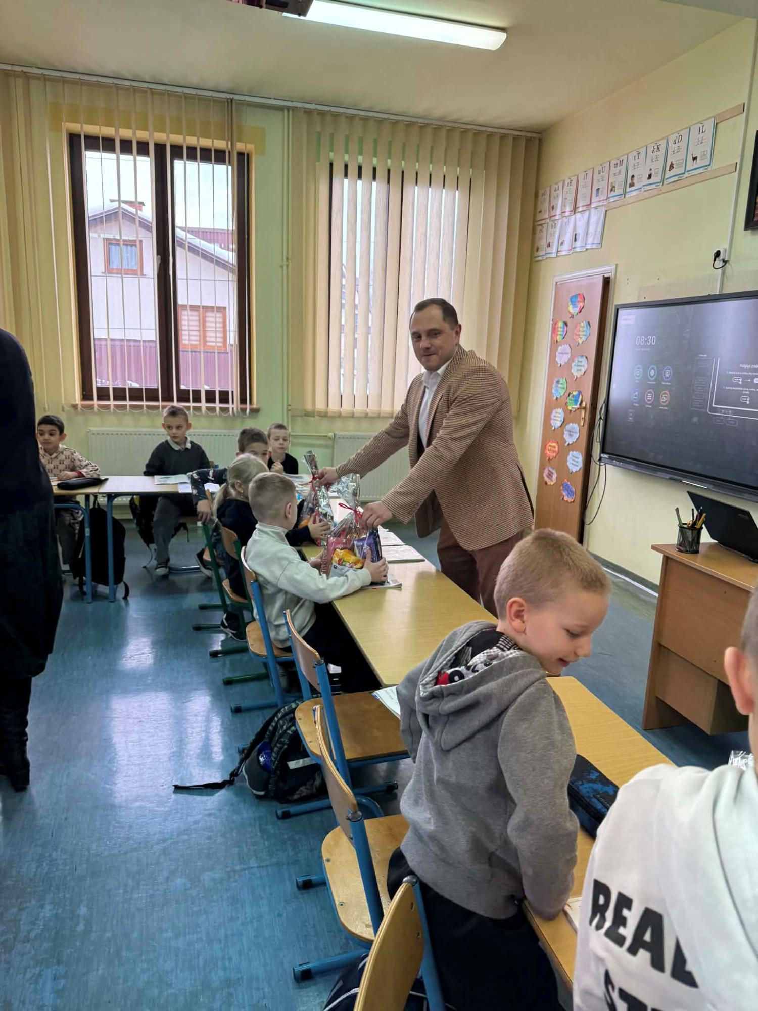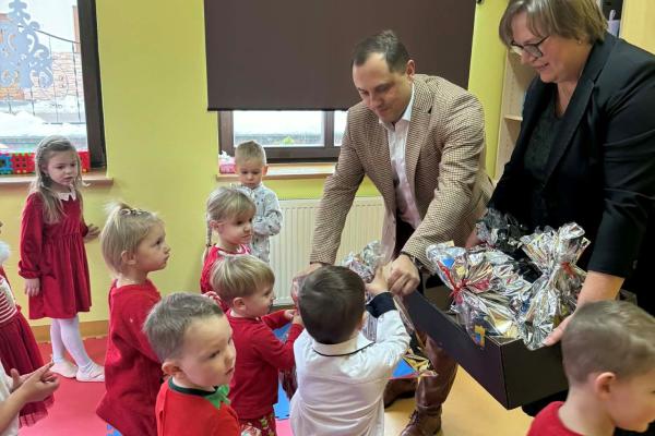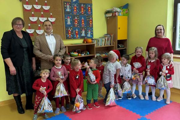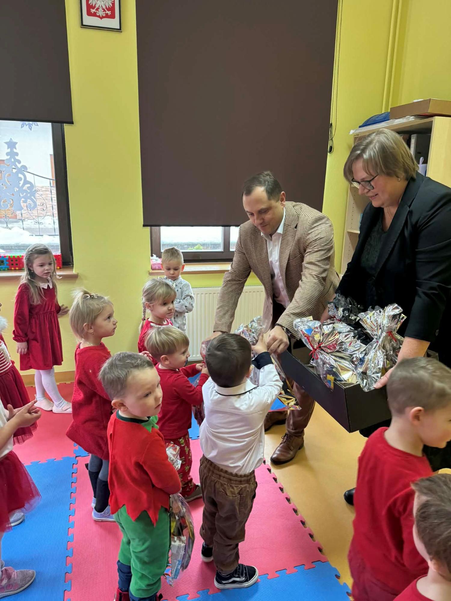 Do przedszkolaków i uczniów klasy 1 zawitał także ze świątecznymi upominkami wójt gminy - p. Andrzej Pietrzyk, który wręczył dzieciom paczki pełne smakołyków.
