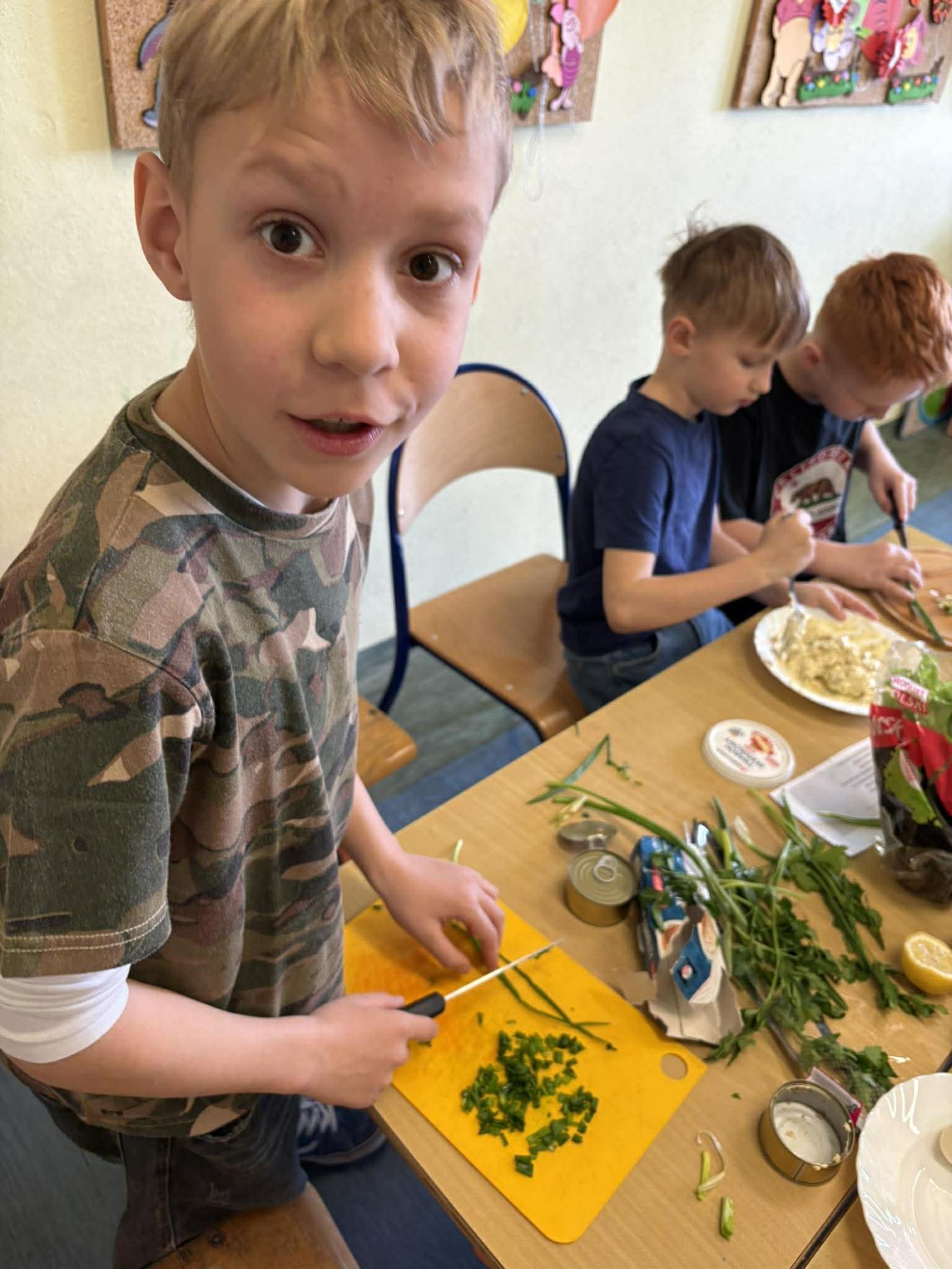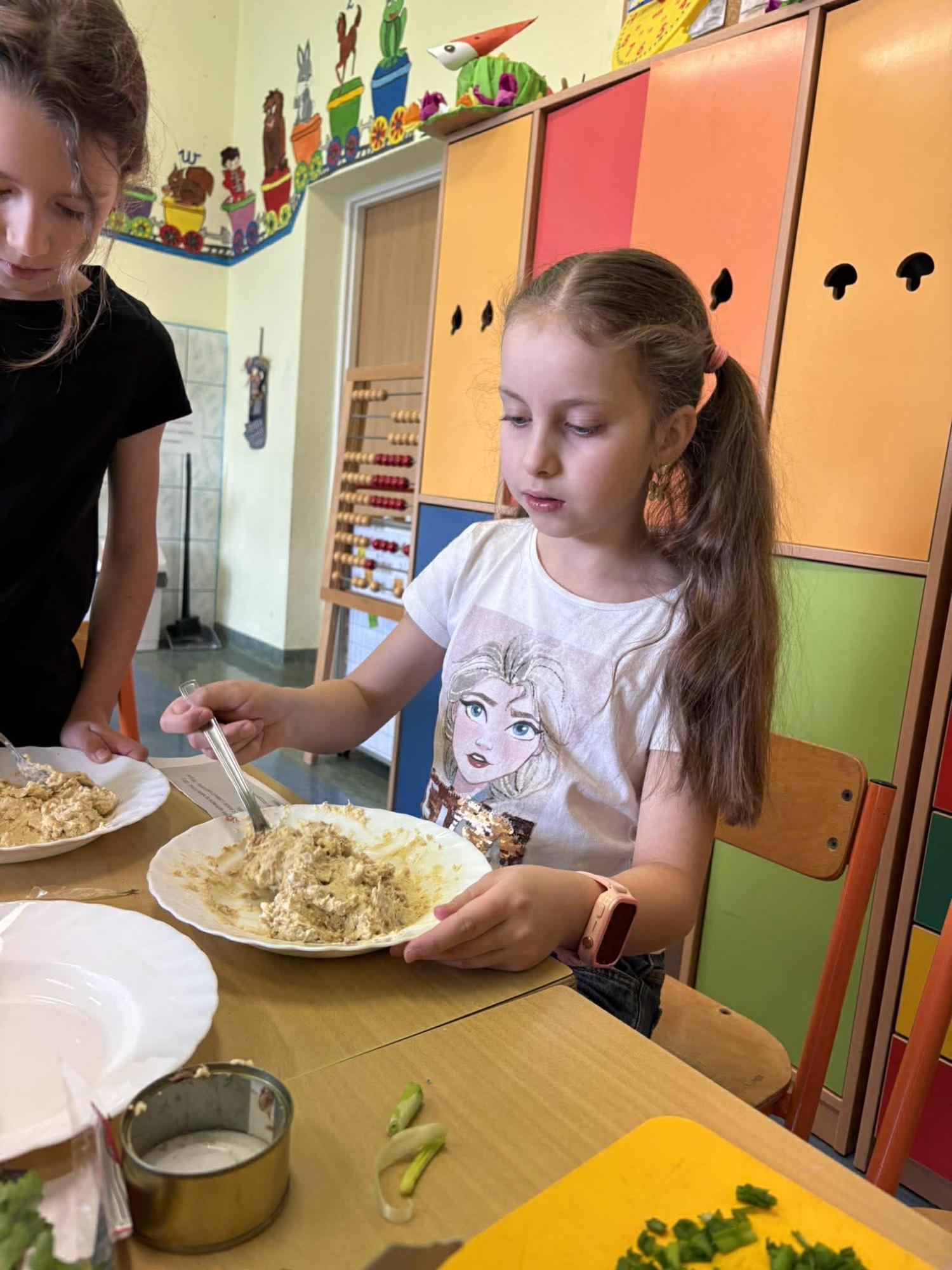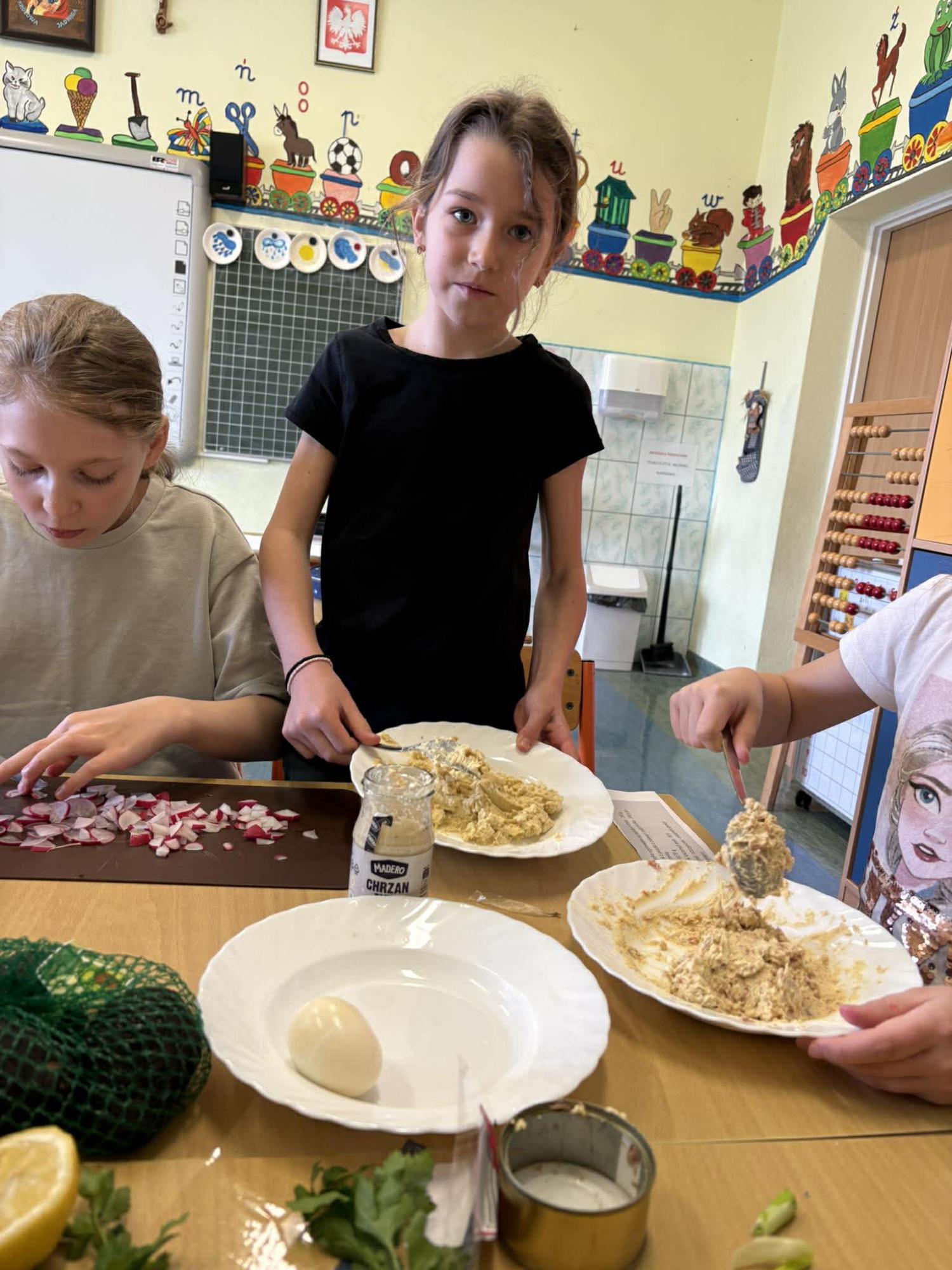 Po pełnej wrażeń zabawie dzieci przystąpiły do przygotowywania pysznego śniadania. Wspólnie tworzyły różnorodne pasty jajeczne, dodając swoje ulubione składniki. Na stołach pojawiły się kolorowe, apetyczne kanapki, które wszystkim bardzo smakowały.