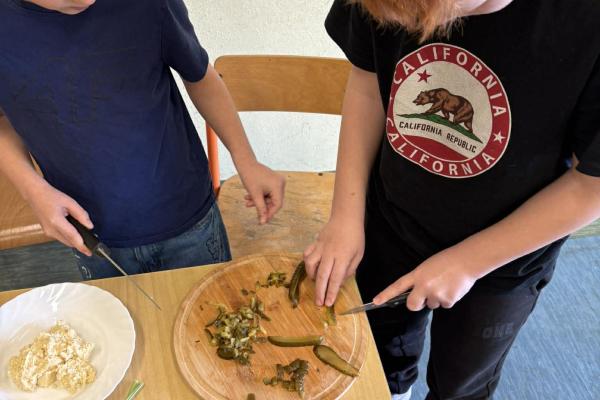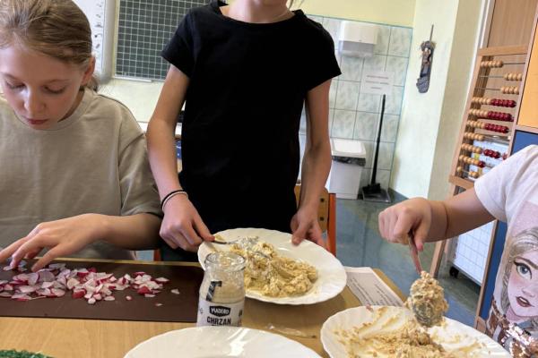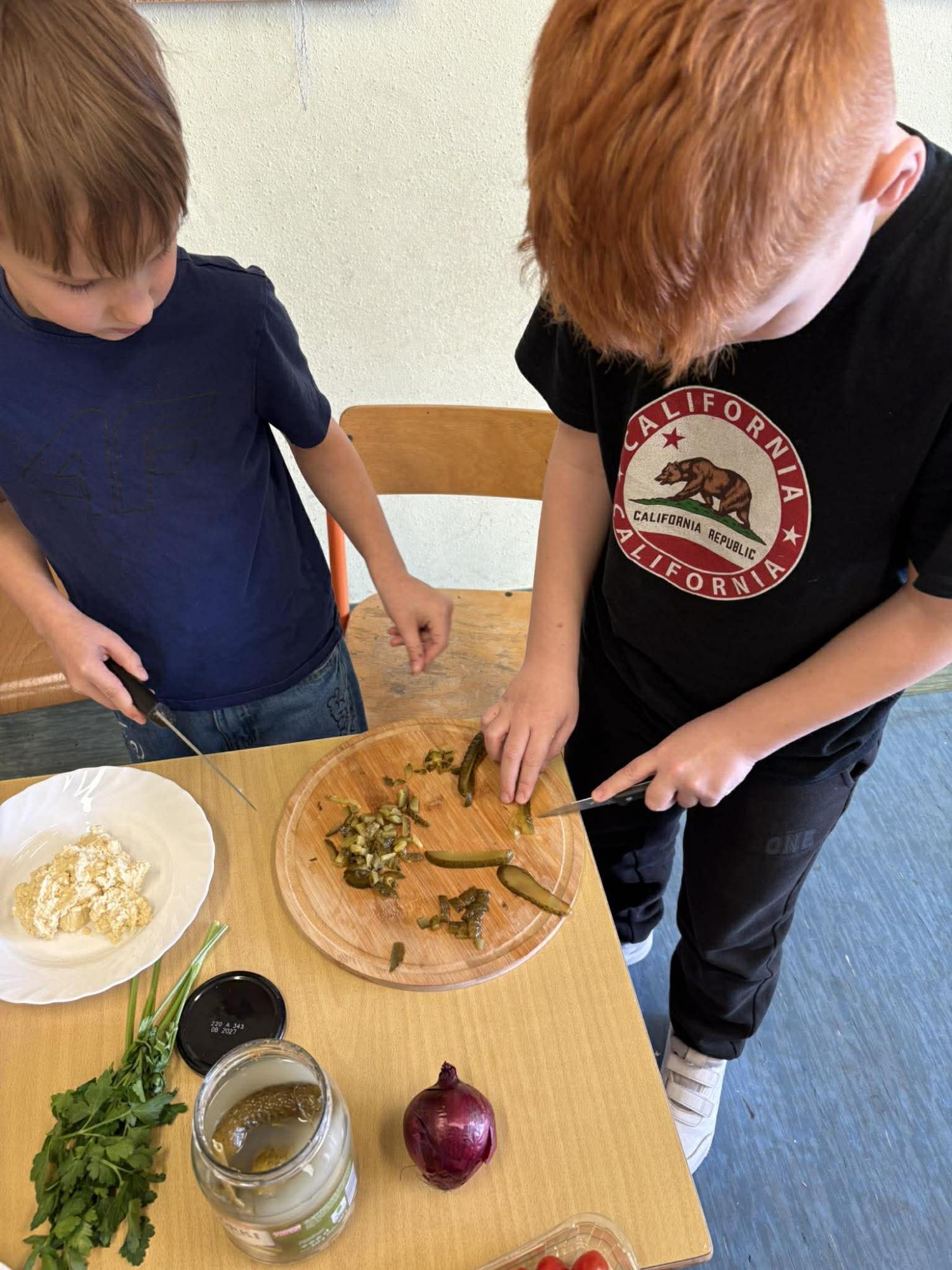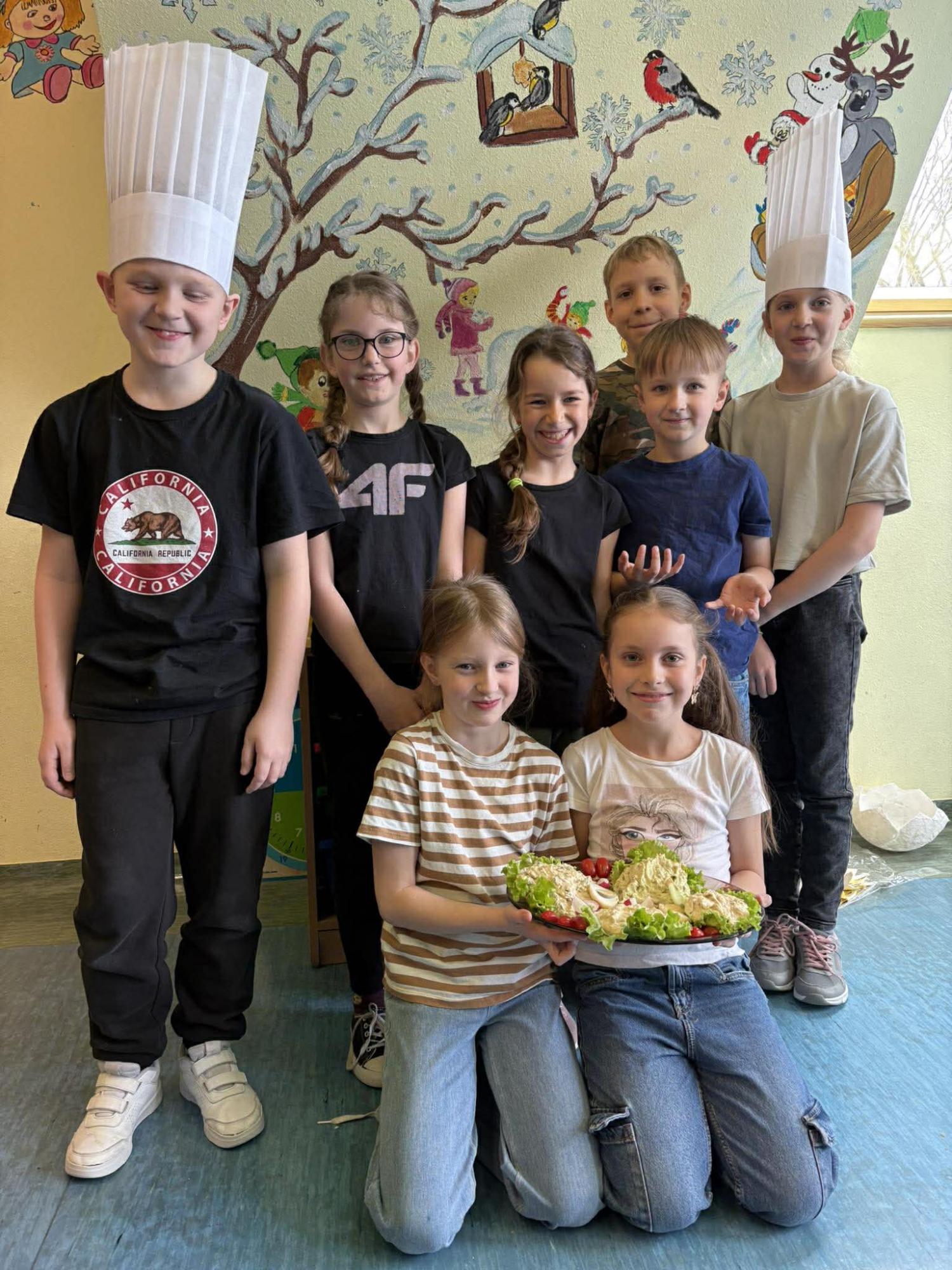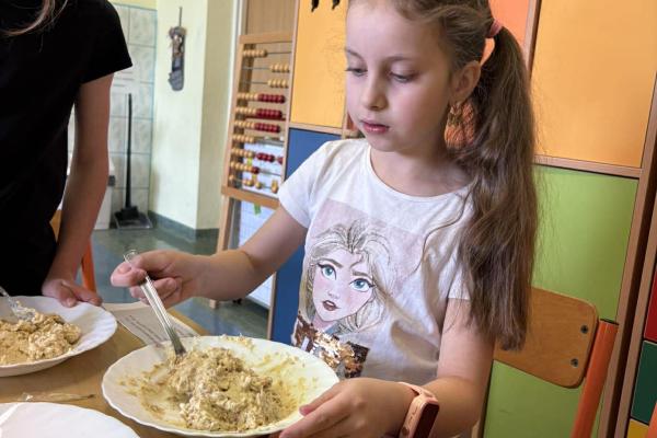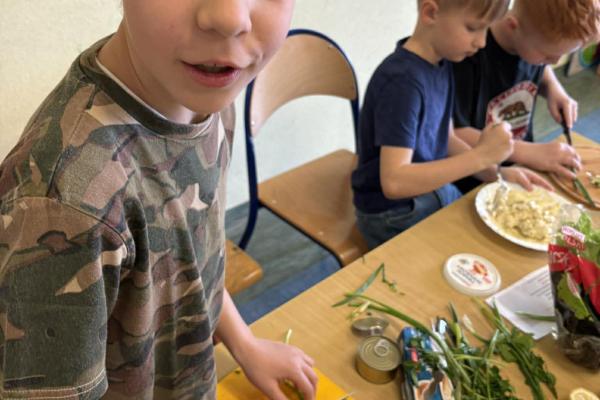 Po pełnej wrażeń zabawie dzieci przystąpiły do przygotowywania pysznego śniadania. Wspólnie tworzyły różnorodne pasty jajeczne, dodając swoje ulubione składniki. Na stołach pojawiły się kolorowe, apetyczne kanapki, które wszystkim bardzo smakowały.
