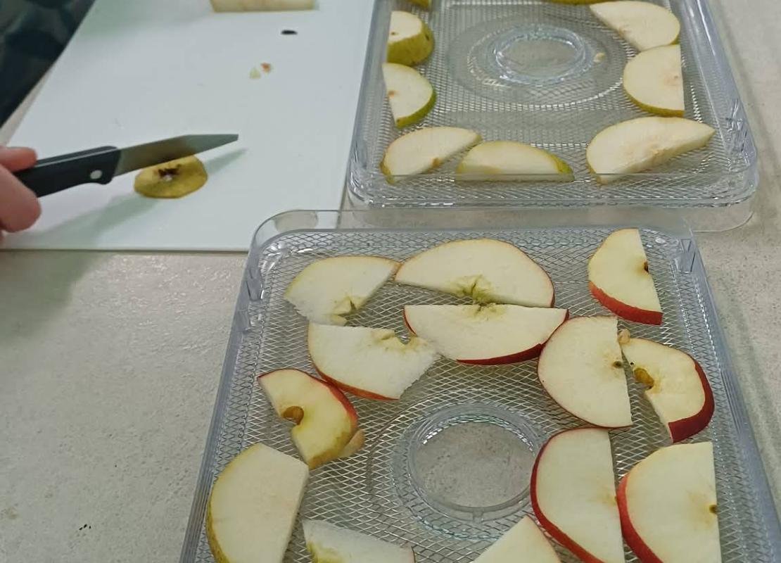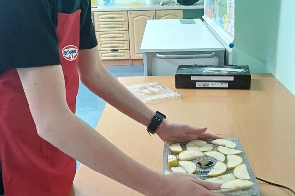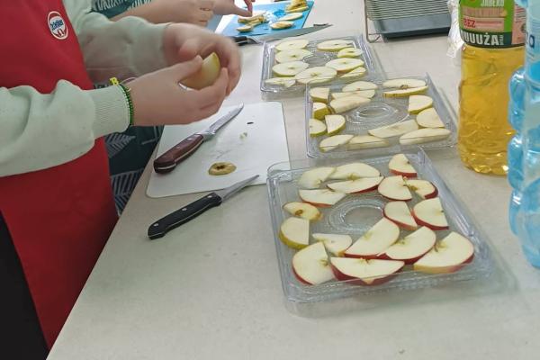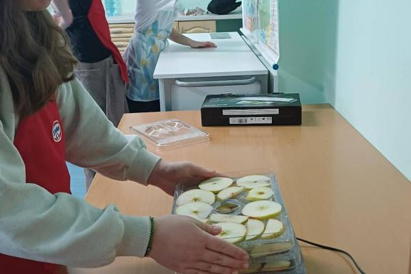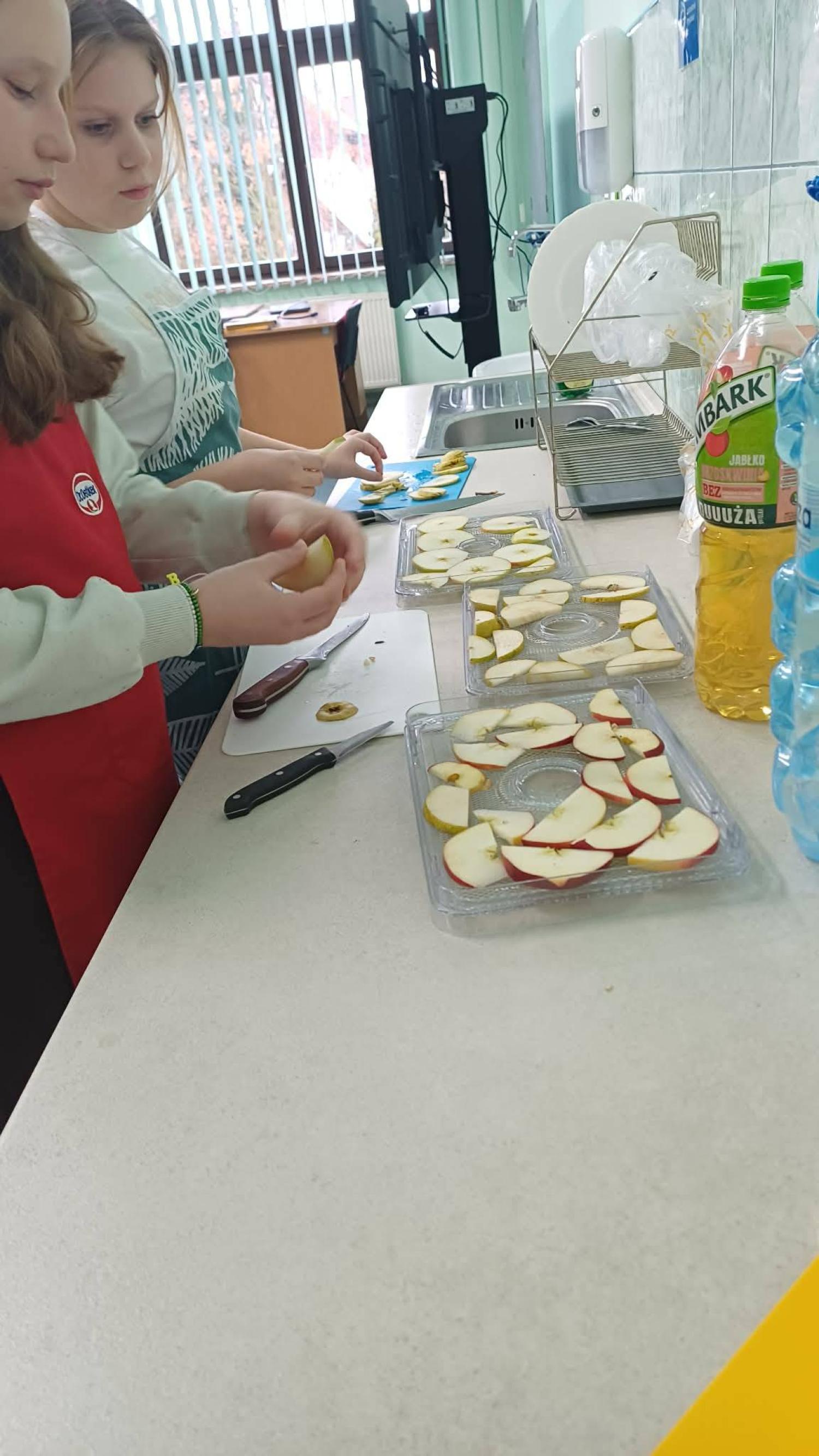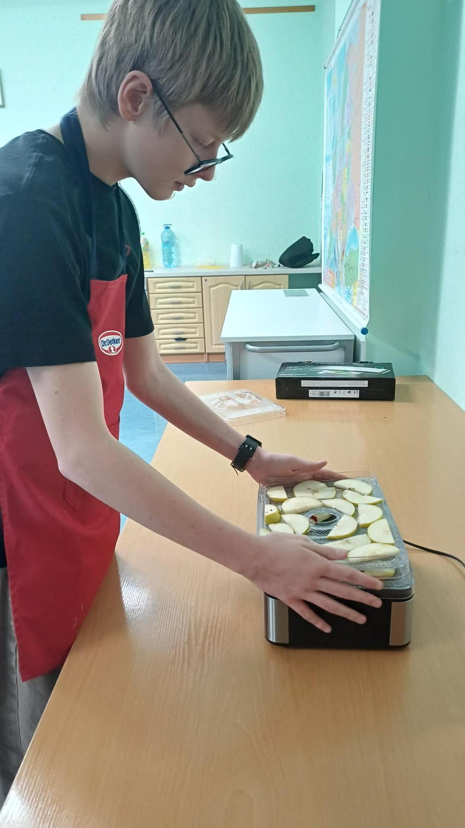 Kolejnym etapem zajęć było przygotowanie owoców do suszenia. Uczniowie myli, obierali i kroili owoce, zwracając uwagę na higienę pracy oraz odpowiednią grubość plastrów. Następnie układali je w suszarce do owoców, poznając zasady jej działania oraz znaczenie odpowiedniej temperatury i czasu suszenia.