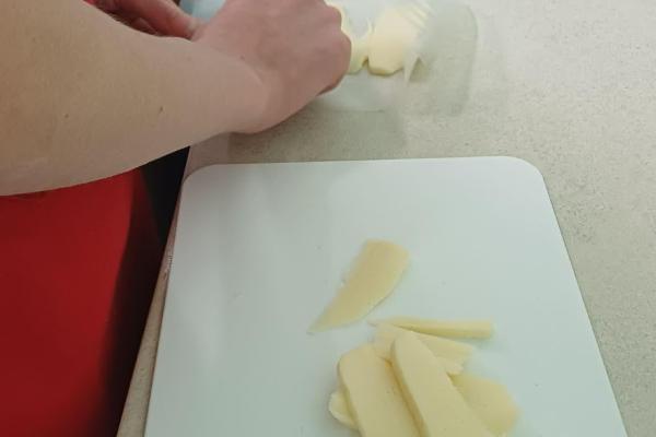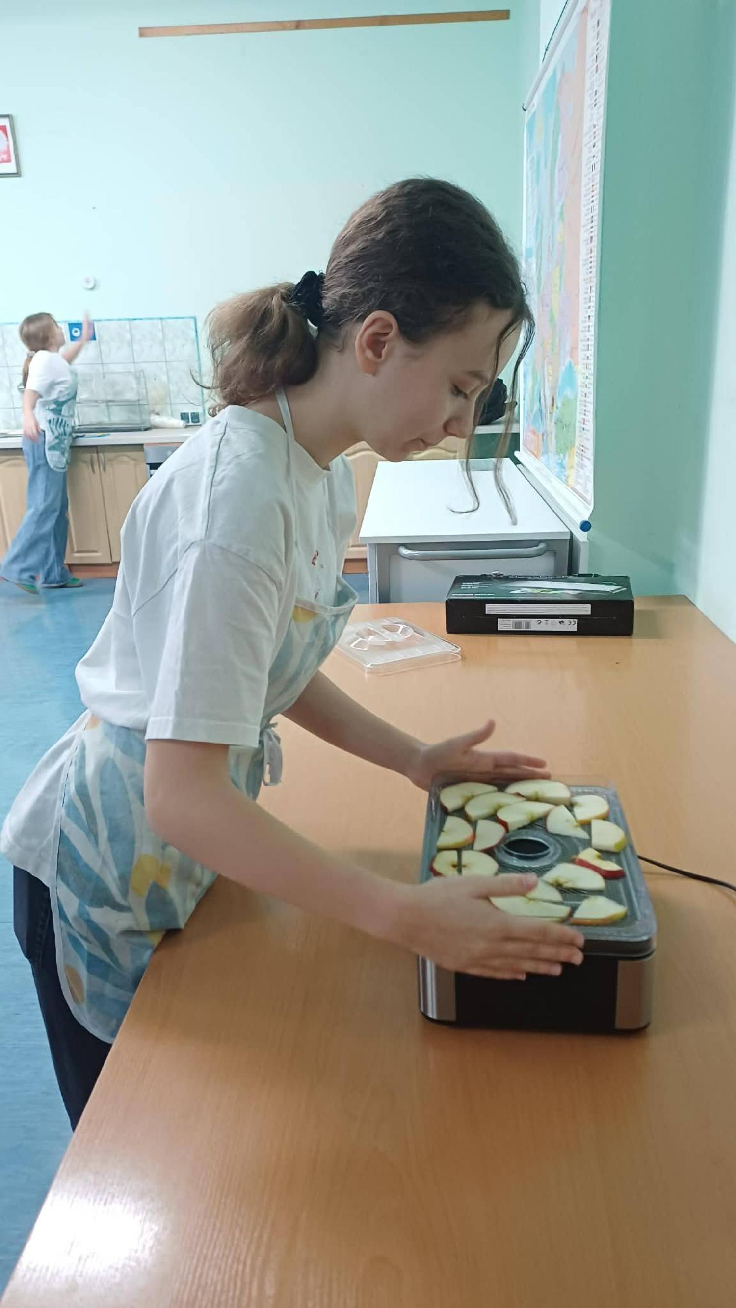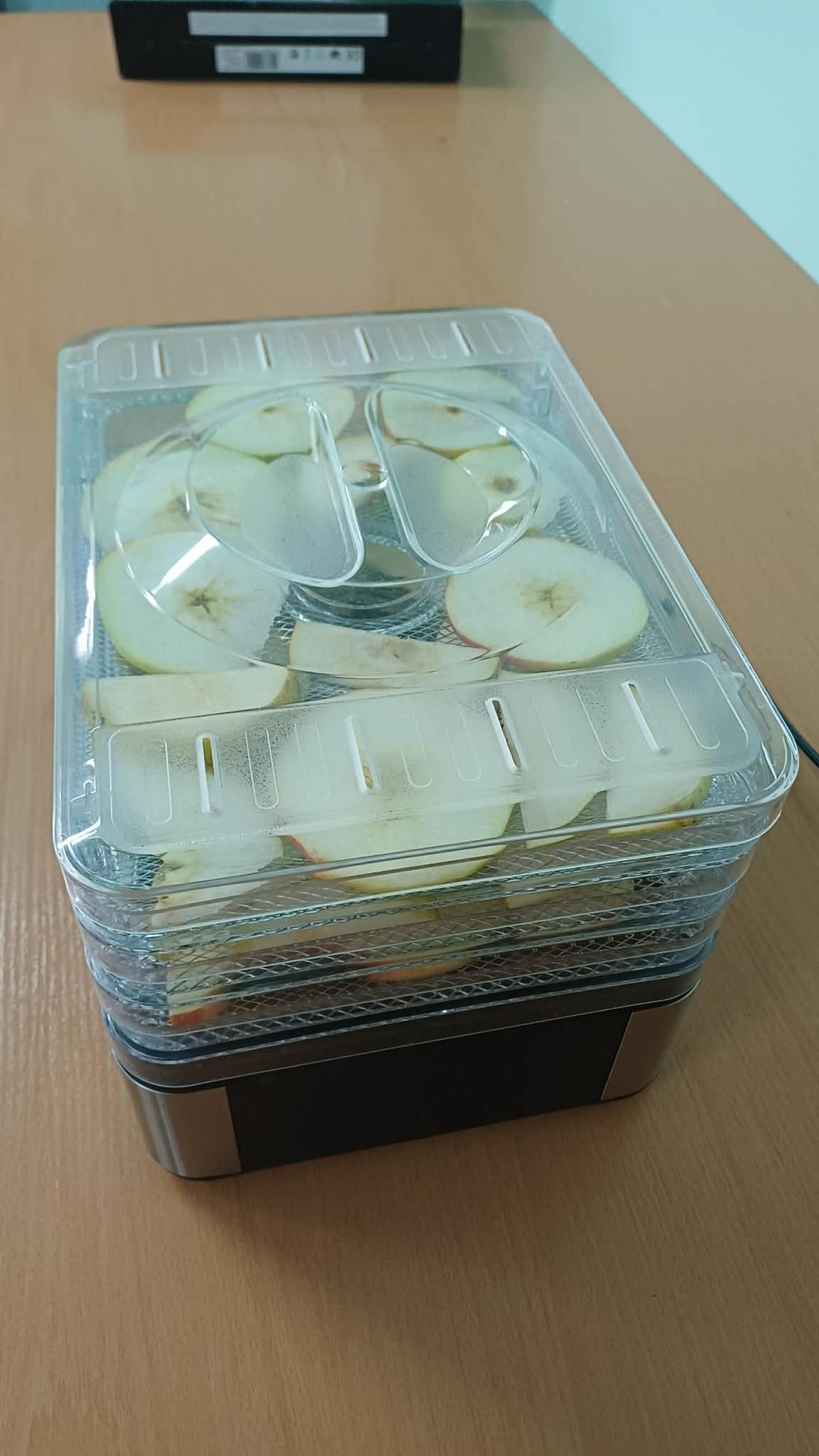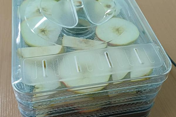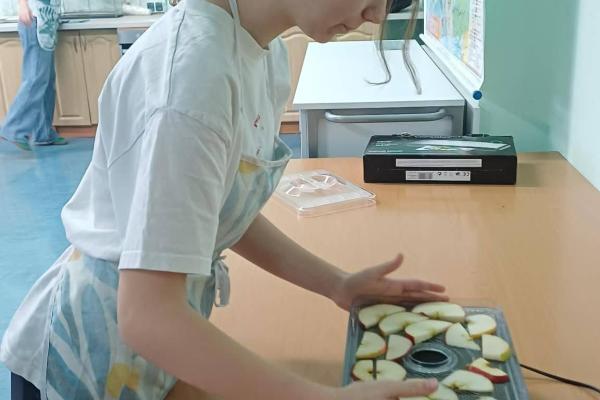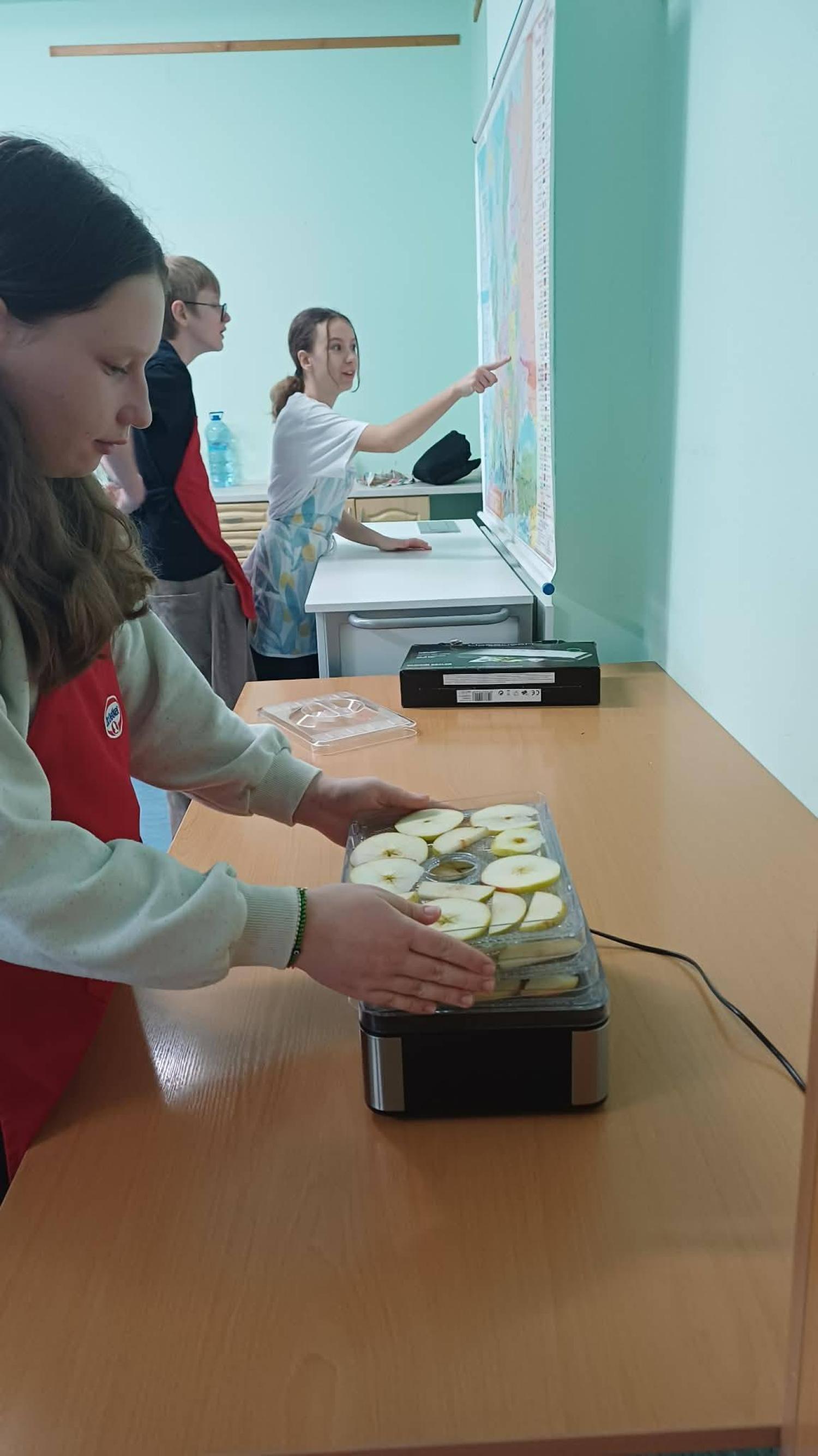 Kolejnym etapem zajęć było przygotowanie owoców do suszenia. Uczniowie myli, obierali i kroili owoce, zwracając uwagę na higienę pracy oraz odpowiednią grubość plastrów. Następnie układali je w suszarce do owoców, poznając zasady jej działania oraz znaczenie odpowiedniej temperatury i czasu suszenia.